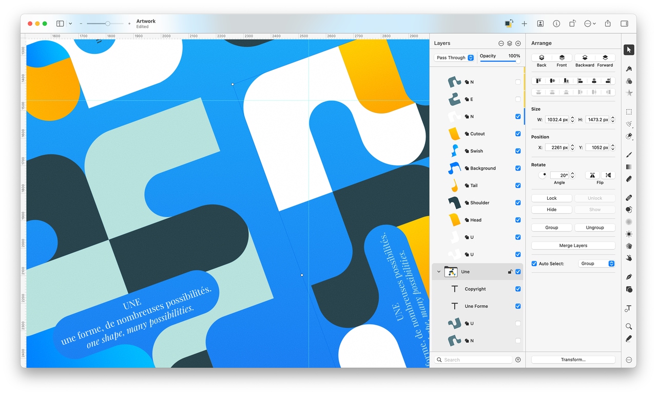 The Arrange tool makes it incredibly easy to create designs. It lets you automatically select layers by clicking them on the canvas, intelligently snaps layers into position as you move them around, and even lets you align and distribute layers automatically.